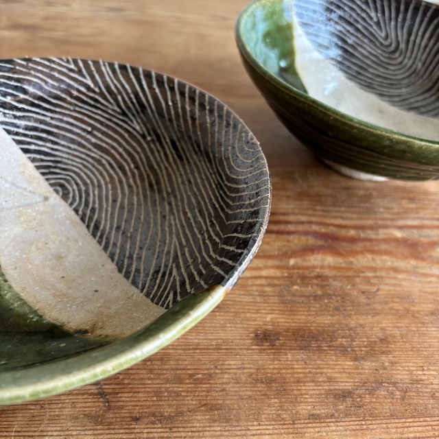 少し大きめのお茶碗です。 器の中に施された円が黒いもの、茶色いもの 2色あり、黒いものは気持ち小ぶりです。 サイズ 黒 直径 約15cm 高さ 約7.5cm 茶 直径 約15.5cm〜16cm 高さ 約7.5cm〜8cm こちらの商品は歪みが特徴的なものです。 おおよそのサイズを記載しています。 下へ、スクロールしていただくと動画も掲載していますので併せてご覧ください。 ※価格は商品一点のお値段です。 器について 《取扱い》 当店で扱っている器は電子レンジ、オーブン、食器洗浄機の使用はおすすめしておりません。 《個体差》 ひとつひとつ手仕事でつくられているため、同じ形のものでも個体差があります。形、大きさ、色合い、釉薬のかかり具合などひとつとして同じものはなく表情が異なり掲載した写真と若干異なる場合がございます。 できる限りそのものに近いイメージが伝わる様に掲載写真は自然光で加工せずに撮影をしております。その為、商品画像をスライドすると同じものでも少し色合いや質感が違う様に見える場合があります。角度、光加減で様々な表情が出るというようにご理解ください。 在庫が数点ございましても商品をご指定いただくことはできません。予めご理解とご了承の上、お買い求めください。 器との一期一会の出会いをお楽しみください。